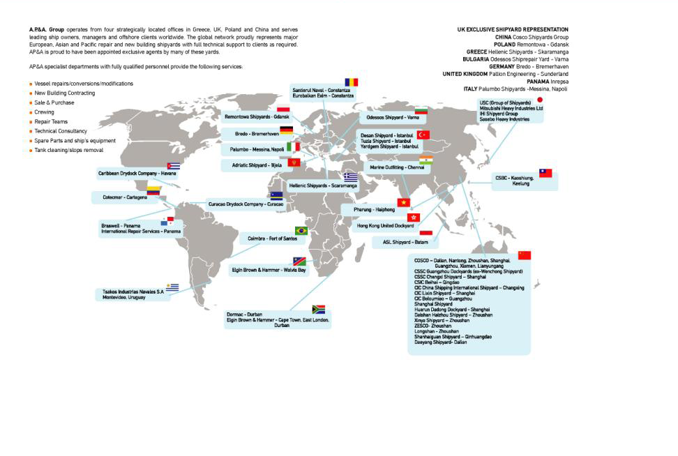Download APA Worldwide Shipyard Representation.bmp (1585 views)A.P&A. Group is a group of companies run from four strategically located offices in the UK, Greece, Poland and China.